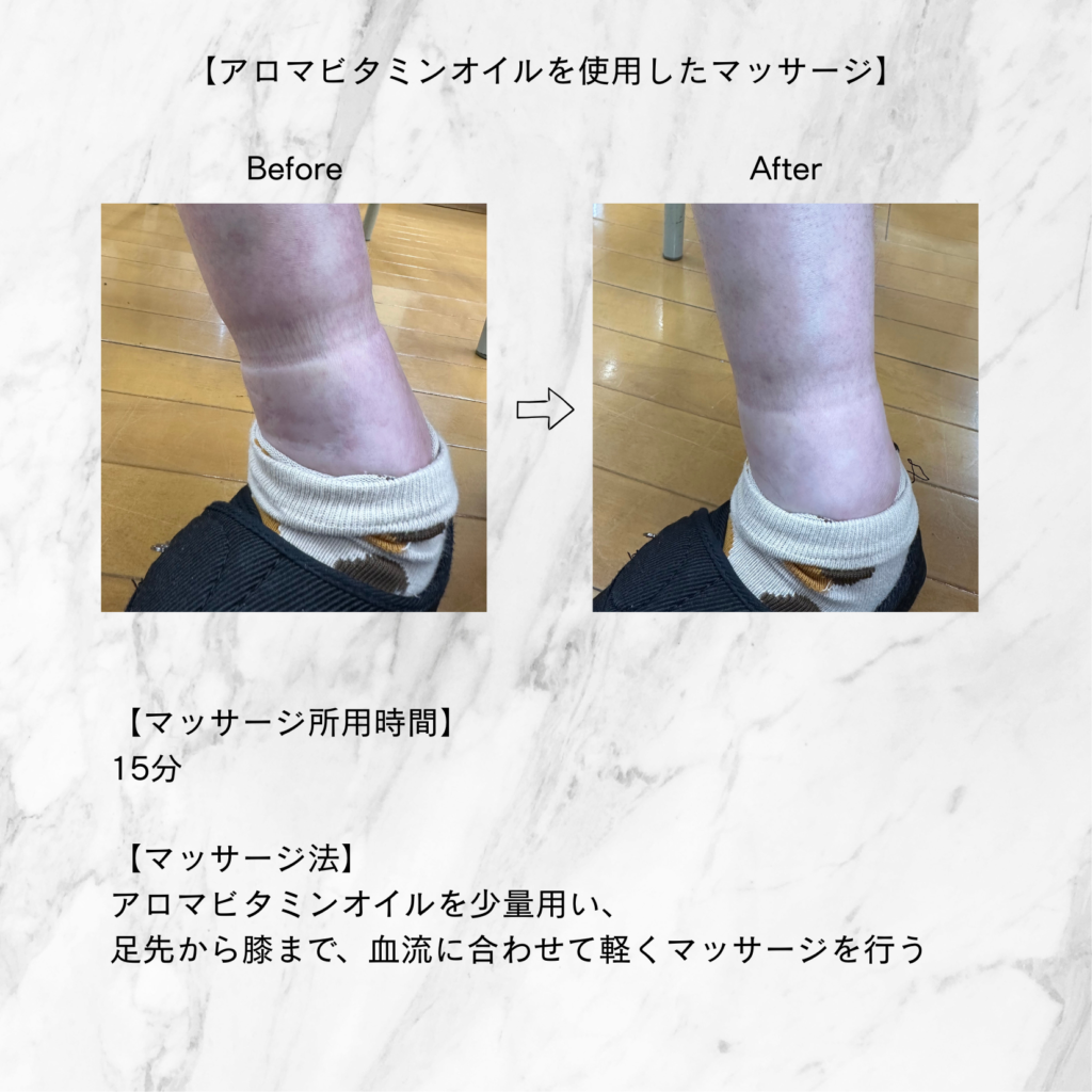 例えば私の場合、3年前施設にいた当初、足のむくみの悩まれる利用者の方をよく拝見していました。足の位置を高くしたり、足湯をしたり、体組織を傷つけないように軽くさすったりしていましたが、改善傾向は見られませんでした。