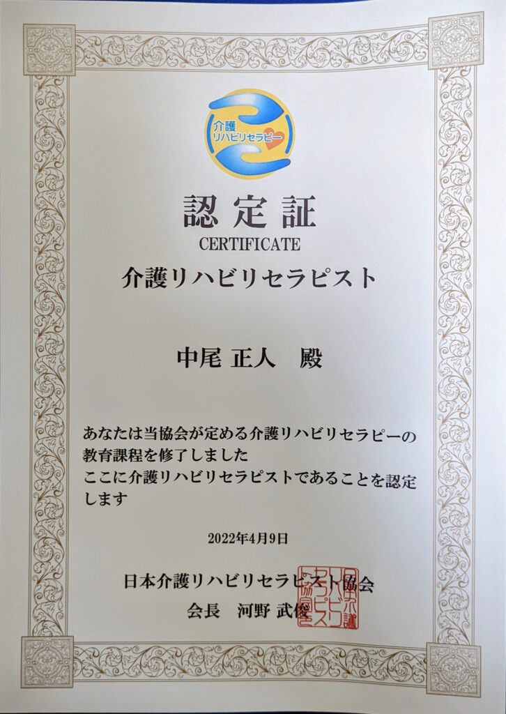 そうしてしっかりと技術を身につけ、介護リハビリセラピストの認定を受けました。