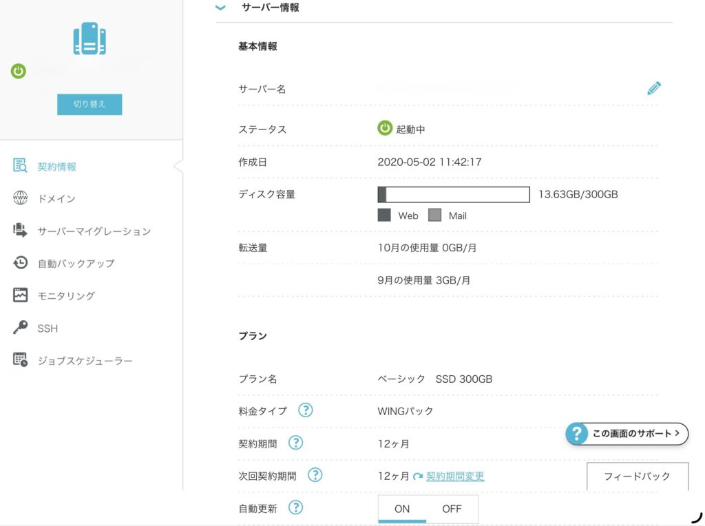 下の画像の通り、私は「ConoHA WING ベーシック 12ヶ月」を自動更新で使っています。