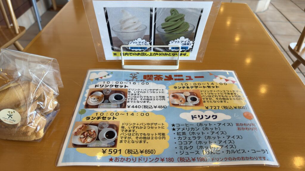 ベーかりーたんぽぽさんは販売だけでなく喫茶スペースもあり、購入したパンを室内で食べることもできます。また時間帯に応じてそれぞれお得なセットメニューがあります。