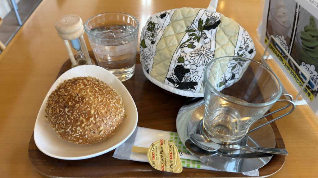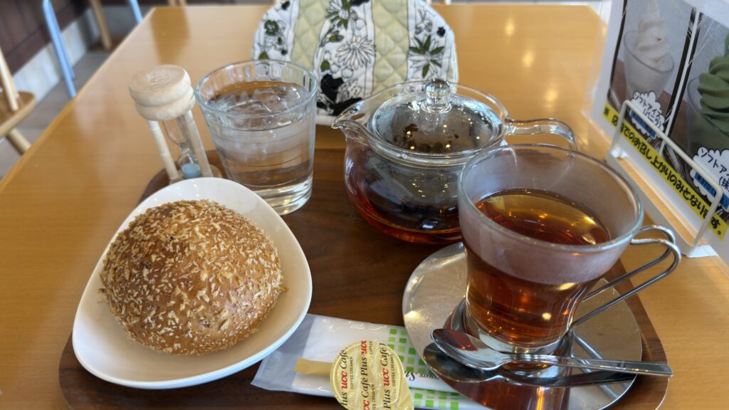 この中で私が選んだのはランチセットでその場でカレーパンとホットの紅茶をいただきました。紅茶は保温カバーで熱を逃さない工夫がされており、蒸らす時間がわかるように砂時計も用意されています。その為温かいまま香りが立つ紅茶をいただけるようになっています。