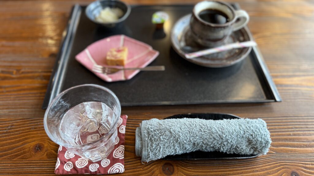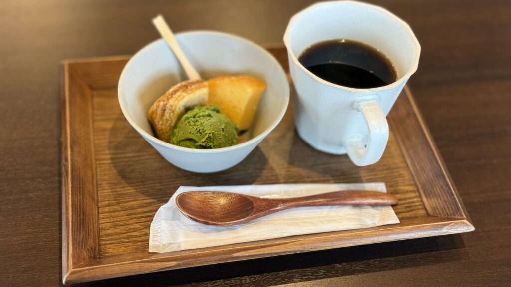 竹炭焙煎珈琲はホットで頼み、口の中に含むと珈琲の香りがいっぱいに広がりました。味わいは苦めで、バウムクーヘンと交互でいただくと相乗効果で楽しめる形となっていました。