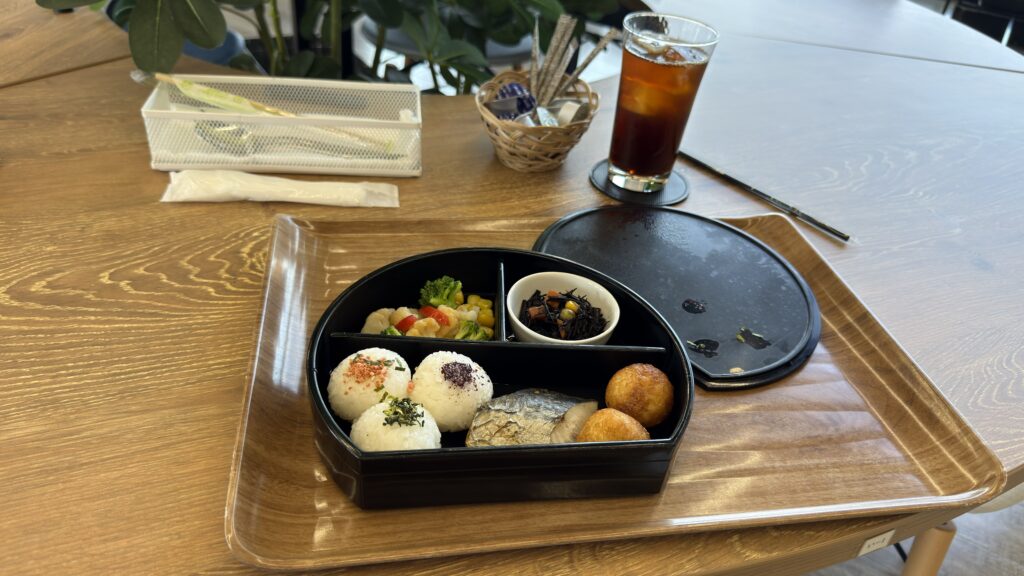 三種の丸おにぎりに焼き魚、揚げたこ焼きに煮物、サラダがついて500円とお値打ちです。