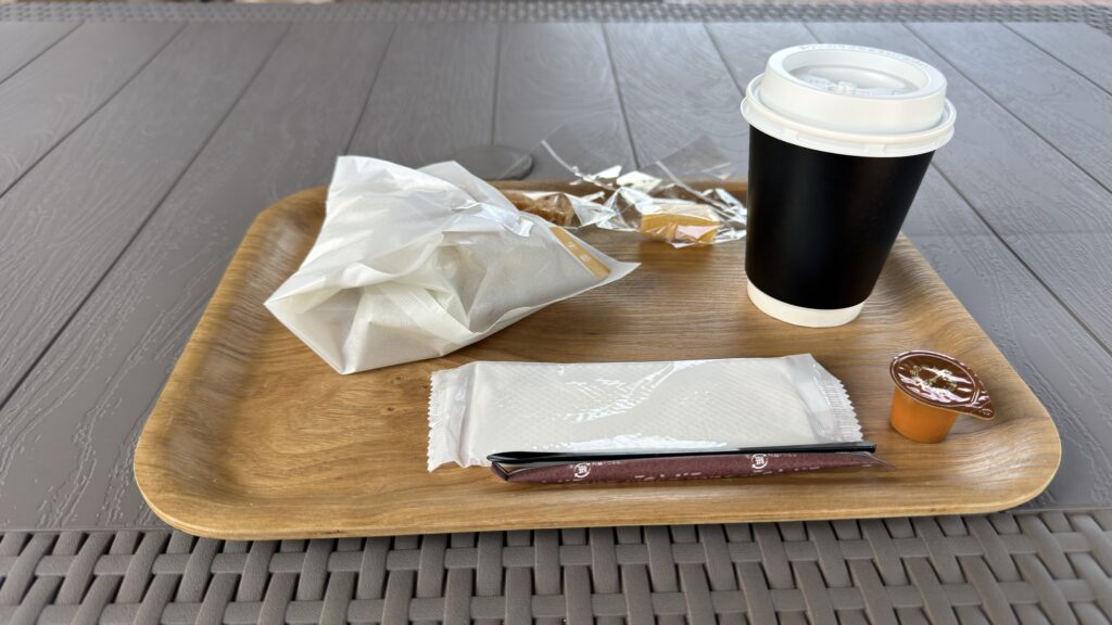 今回頼んだのは竹炭焙煎珈琲とライスバーガー。ライスバーガーは豚生姜焼きとてりやきチキンの2種類があり、今回は豚生姜焼きのライスバーガーを頼みました。